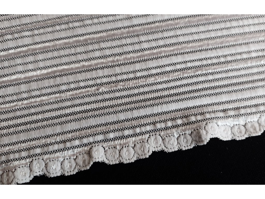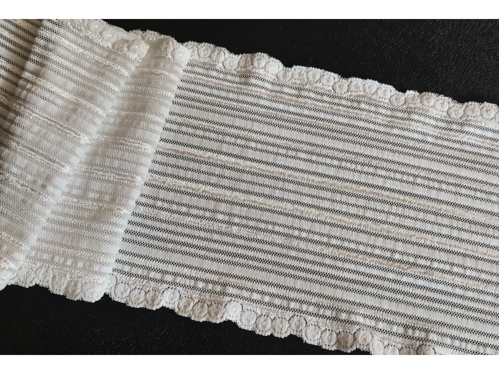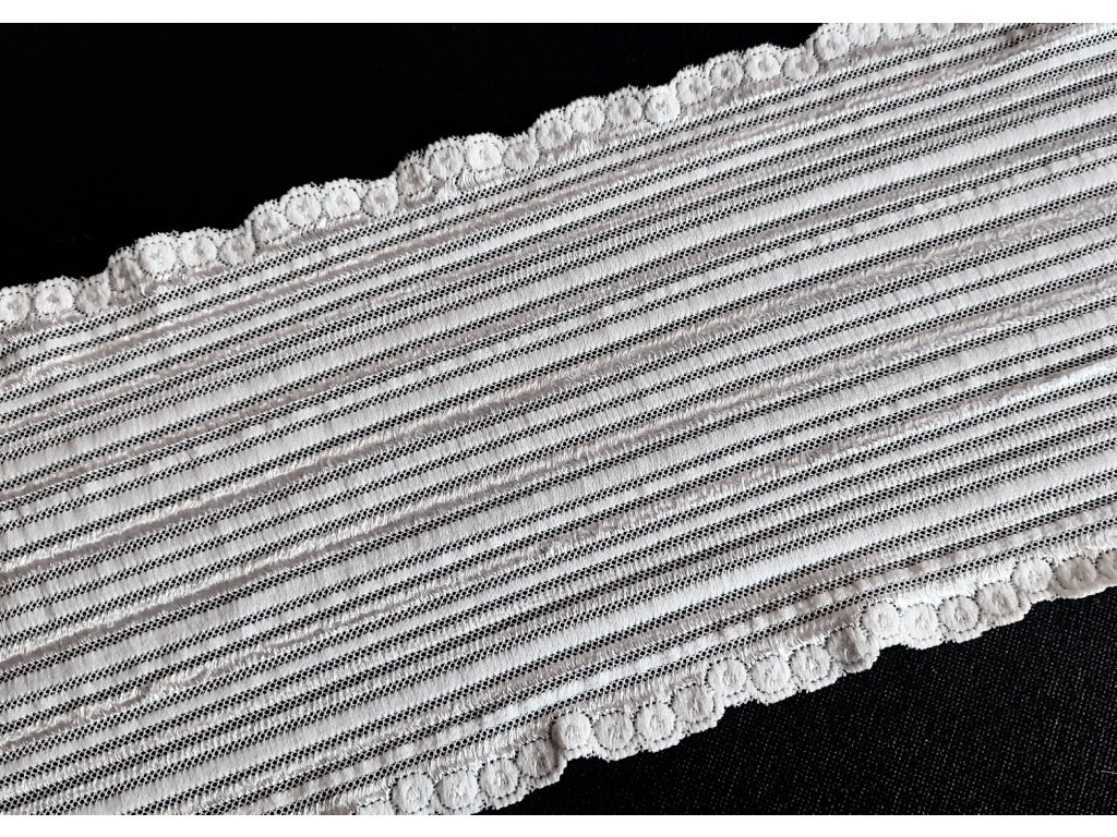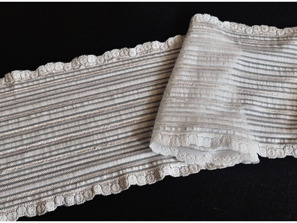 Krajka vyšší gramáže s motivem pruhů a malými kroužky podél lemů krajky. Některé pruhy jsou lesklé. Tato krajka pruží pouze do šířky a je velice jemná na omak, působí jako z bavlnky. Země původu: Itálie.