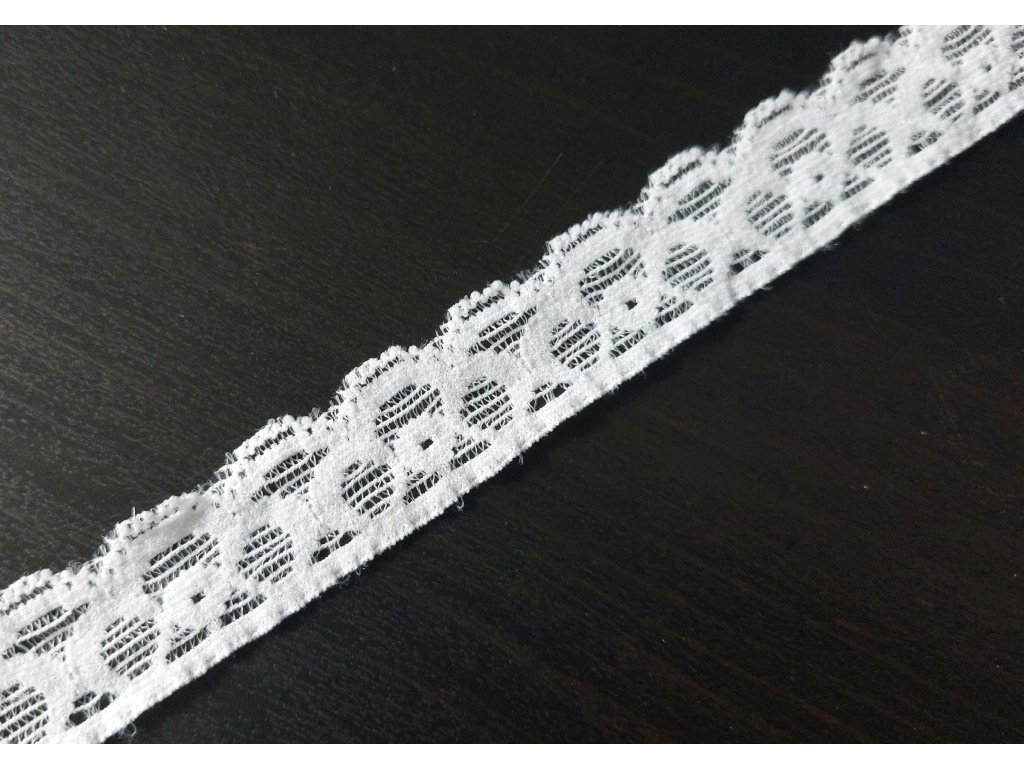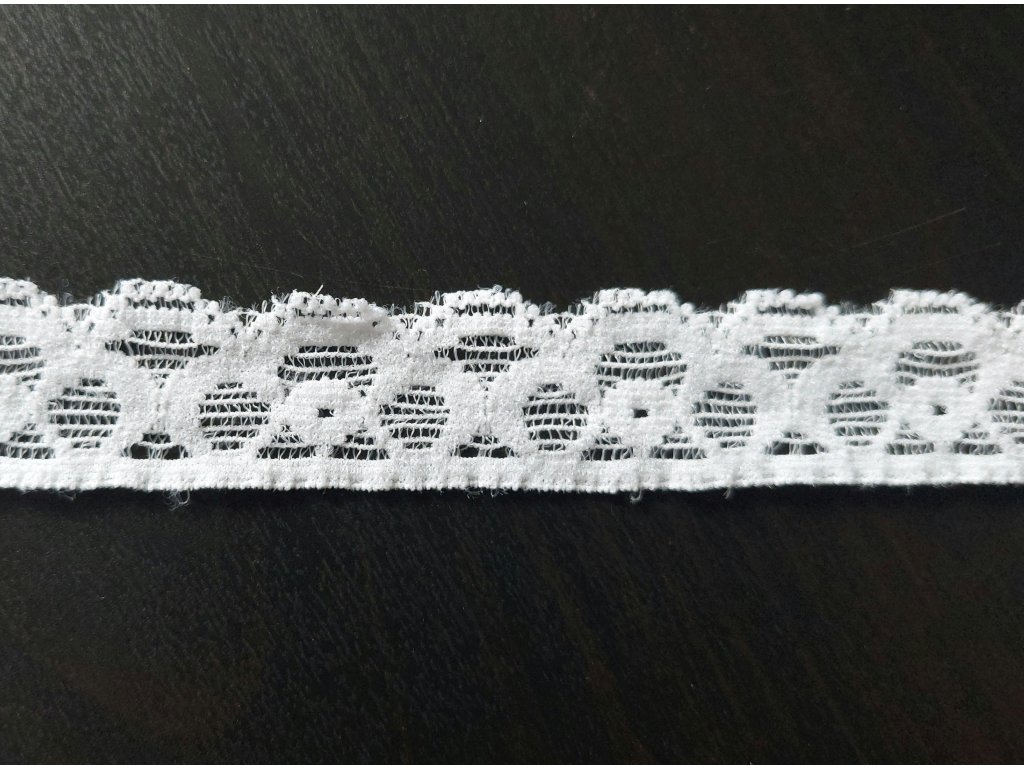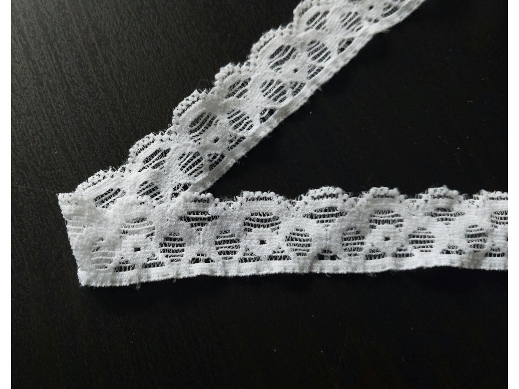 Krásná krajka v bílé barvě s jemným dekorem obloučků.