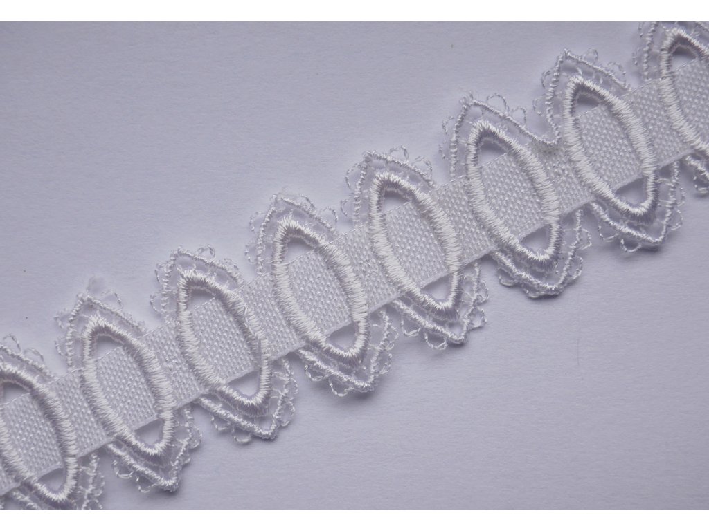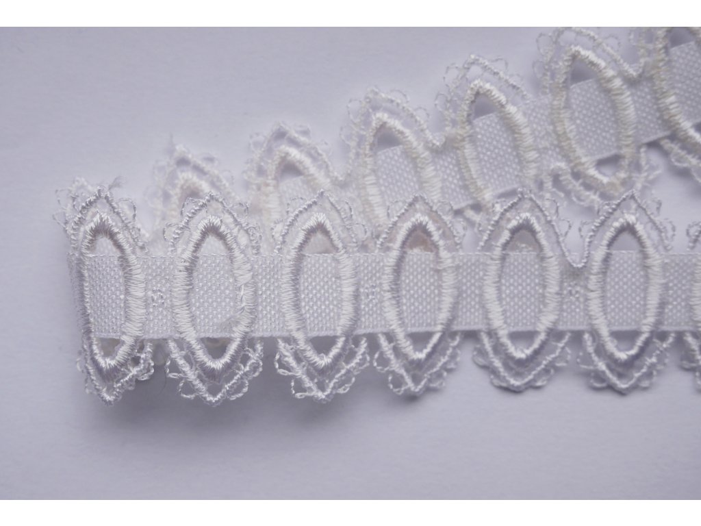 Ozdobná pruženka v bílé barvě, šíře: 27 mm. Středně pevná v tahu.