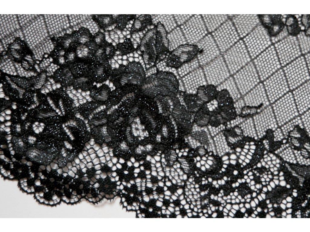 Jemná krajka v černém odstínu s lesklými květy po okrajích, které se třpytí.
