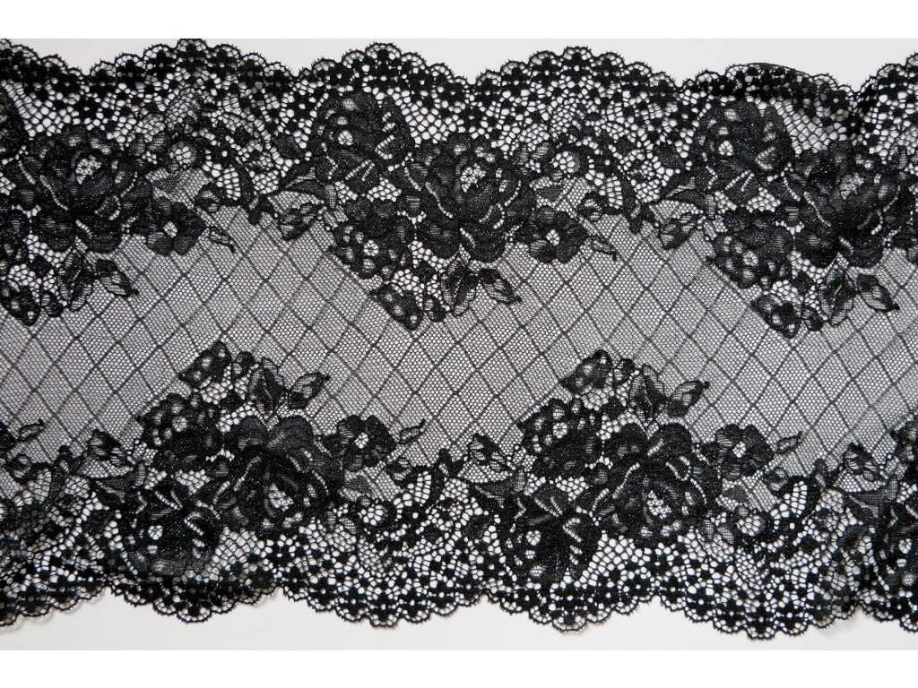 Tato černá krajka s lesklým květinovým motivem je výrazným a elegantním materiálem určeným především pro šití dámského spodního prádla. Kombinace matného podkladu a jemně lesklých květin vytváří sofistikovaný kontrast, který dodává prádlu exkluzivní a smyslný vzhled.