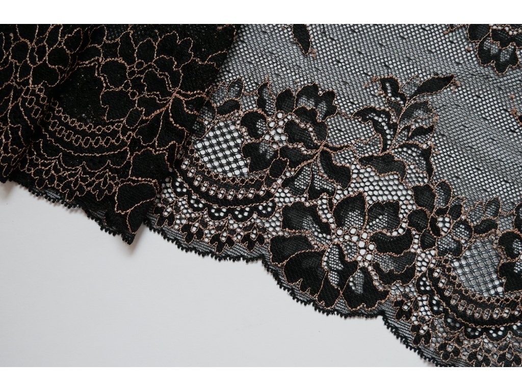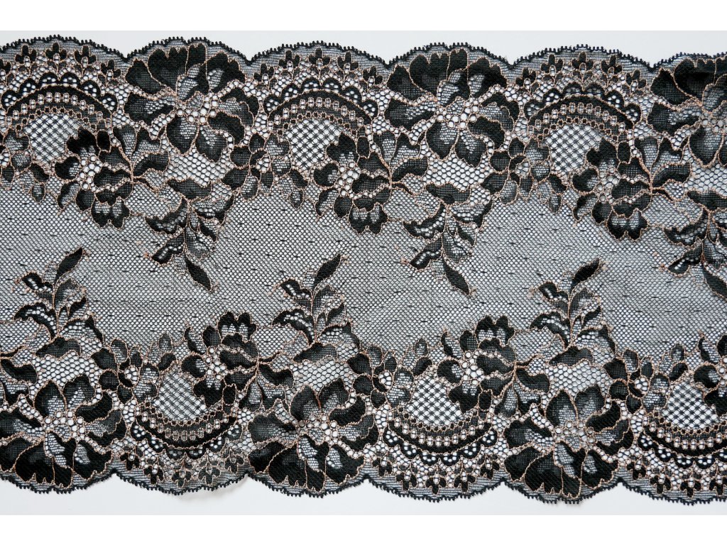 Jemná krajka v černém barevném odstínu s jemným růžovým květinovým motivem.