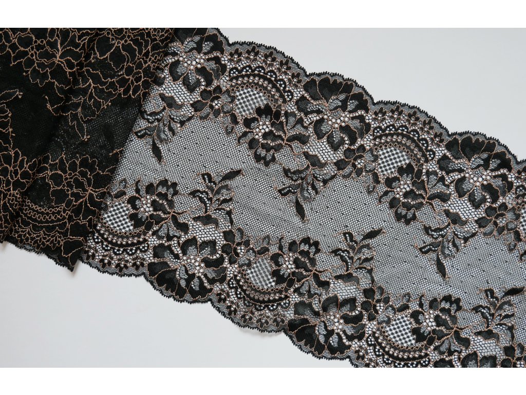 Pružná krajka v černém barevném provedení s jemným květinovým motivem v růžové barvě je ideální volbou pro šití spodního prádla i dekorativních oděvních prvků. Díky své elasticitě se krásně přizpůsobí tělu, zachová si tvar a zajistí komfort při nošení.
