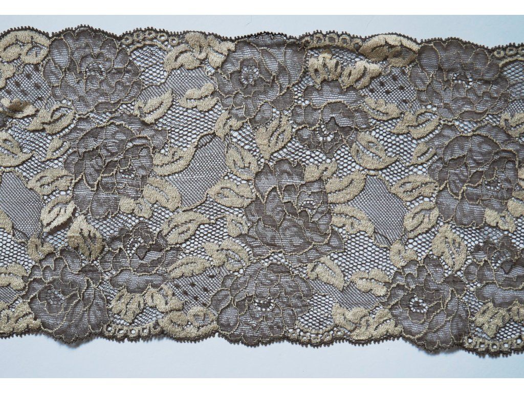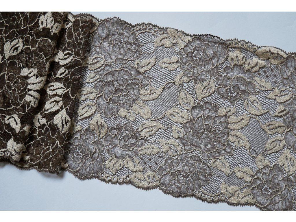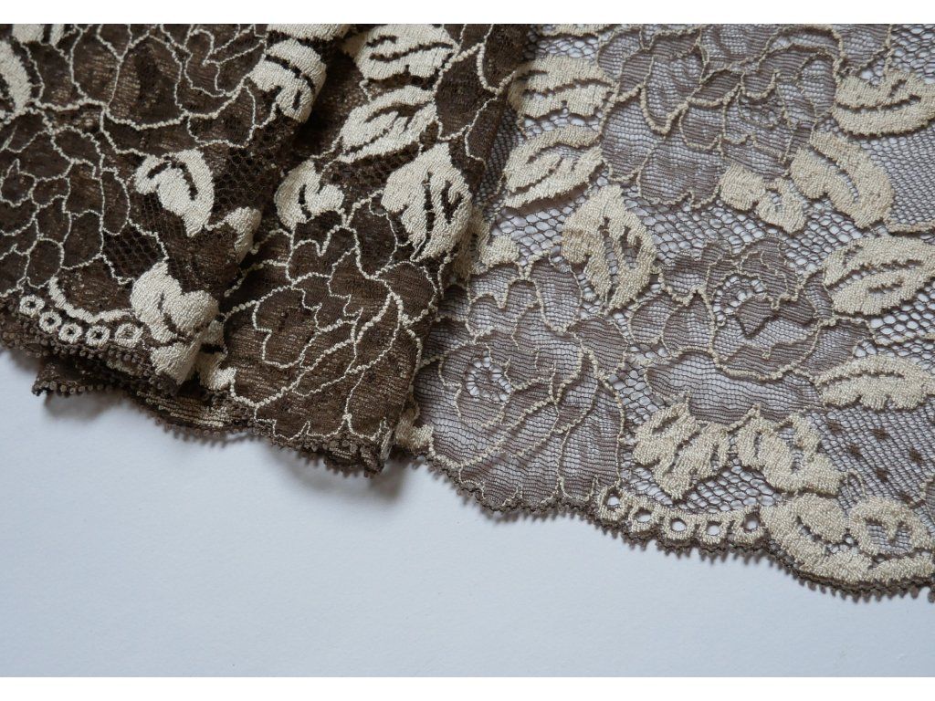 Hnědá krajka s jemným květinovým motivem ve smetanové barvě působí elegantně, hřejivě a zároveň velmi sofistikovaně. Kontrast tmavšího podkladu a světlých květů vytváří výrazný, ale stále vkusný design, který krásně vynikne na hotovém prádle.