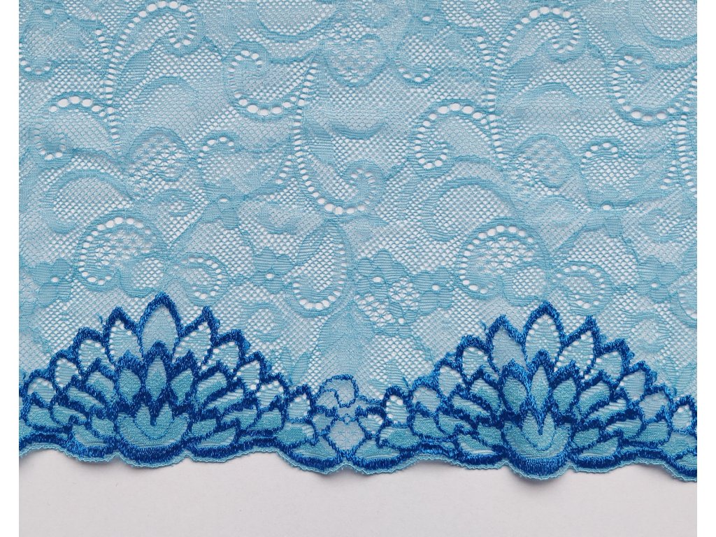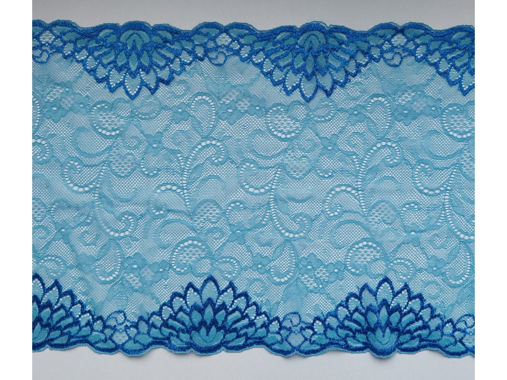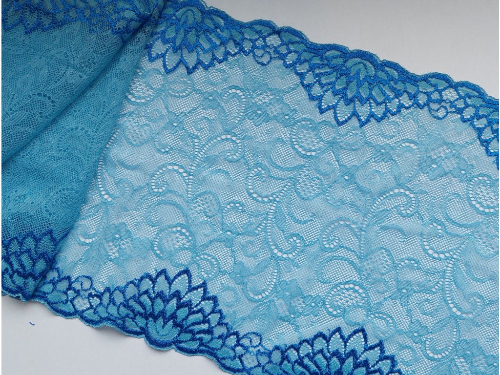 Tato modrá krajka s okraji v tmavší modré barvě je skvělou volbou pro tvorbu elegantního a moderního spodního prádla. Kontrastní tmavě modré okraje krásně zvýrazňují tvar prádla a dodávají hotovému výrobku profesionální a luxusní vzhled.