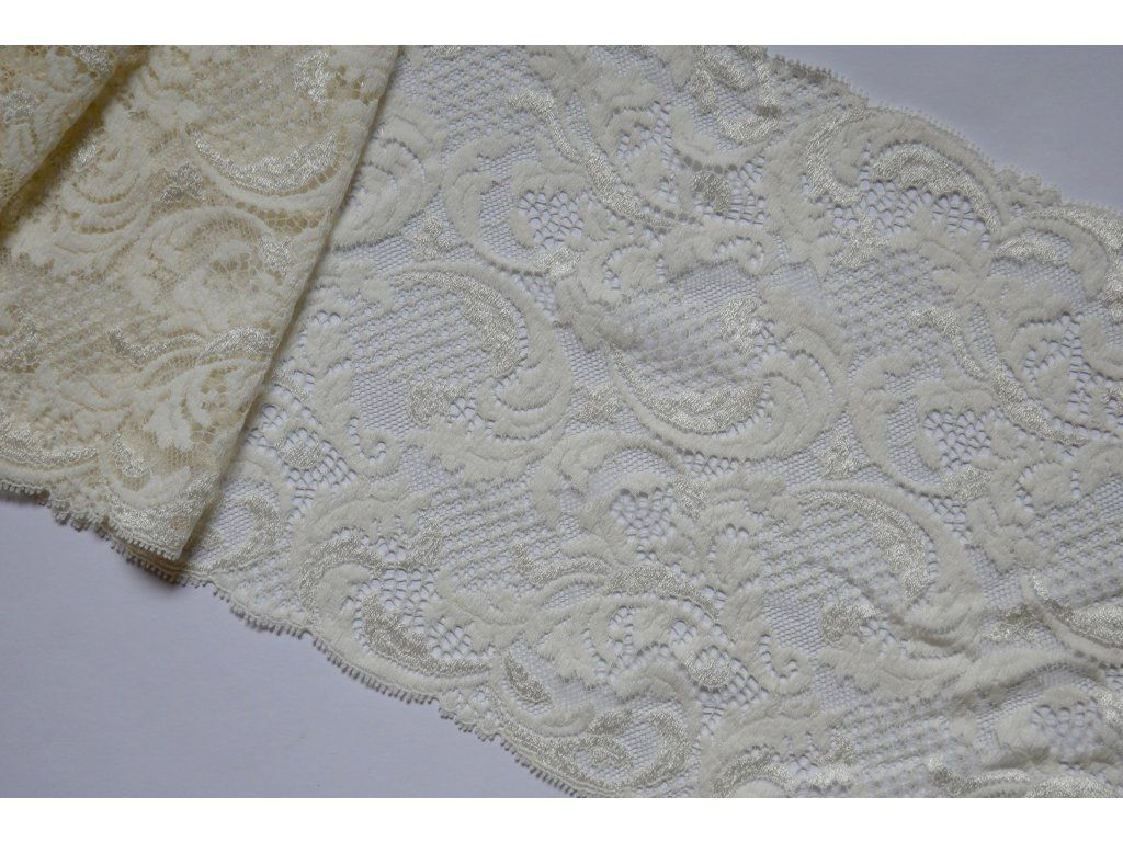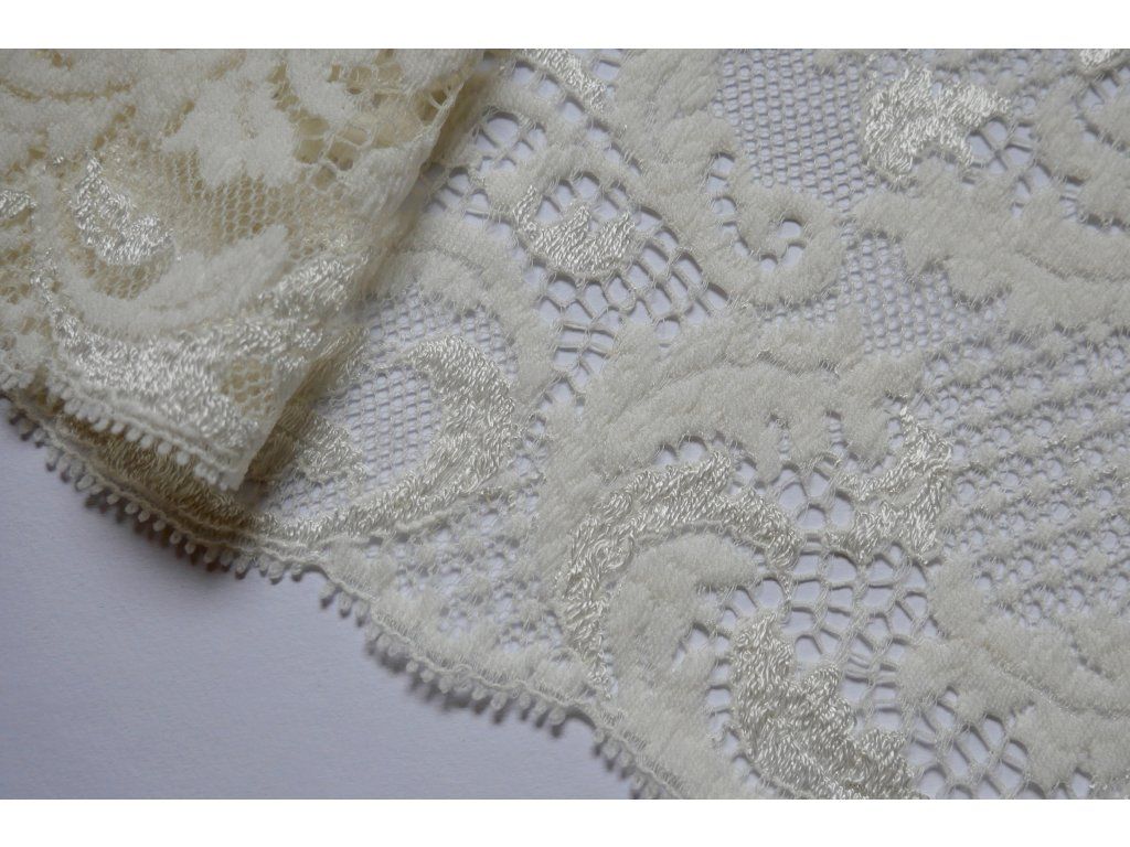 Krémová krajka s historizujícím květinovým motivem inspirovaným zámeckými ornamenty působí velmi elegantně, jemně a nadčasově. Vzor připomíná dekorativní prvky z historických interiérů a textilií, díky čemuž dodává výsledným výrobkům nádech luxusu a výjimečnosti.