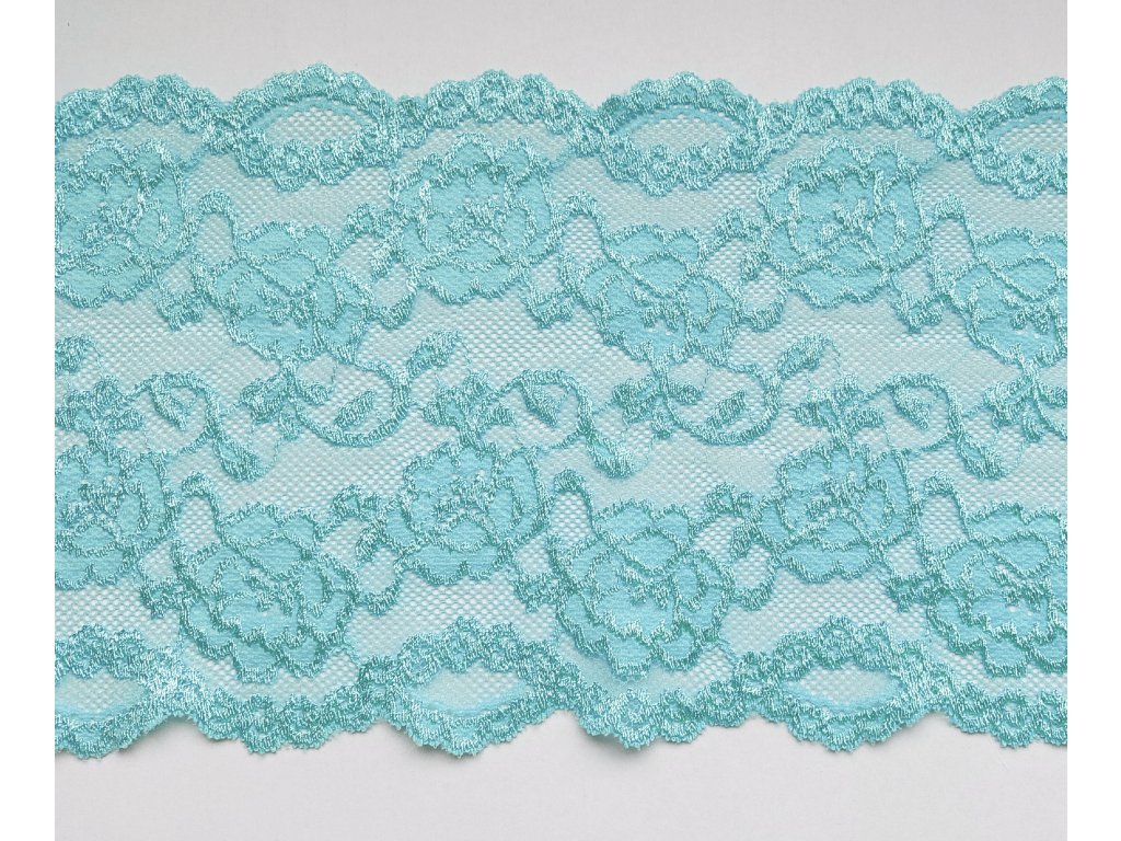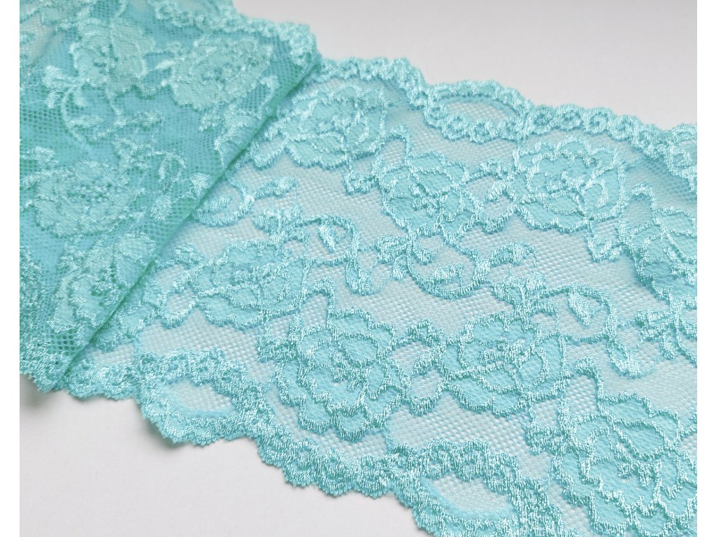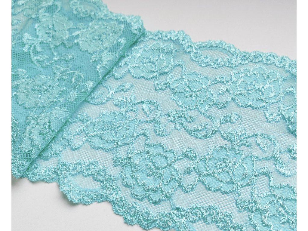Krásná krajka v mátové barvě s květinovým vzorem v lesklém provedení.