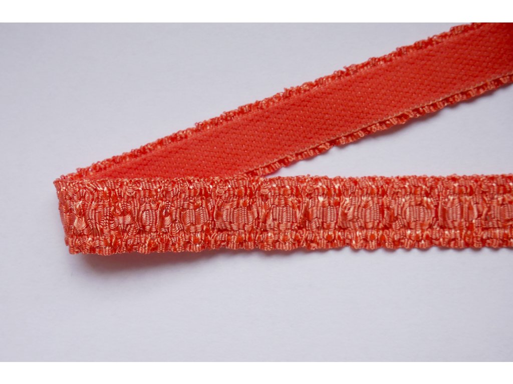 Luxusní ozdobná ramínková pruženka v oranžové barvě o šířce 13 mm s jemně řaseným povrchem je ideální pro šití podprsenek, braletek a designového spodního prádla. Elegantní struktura dodává ramínkům dekorativní vzhled bez nutnosti dalších ozdobných prvků.