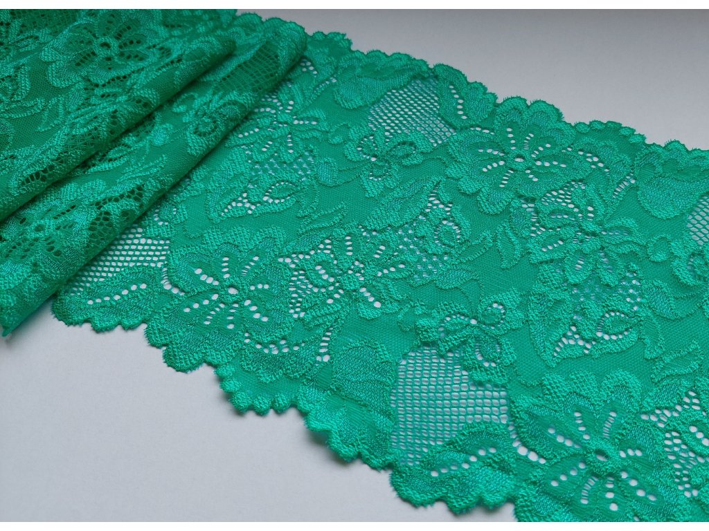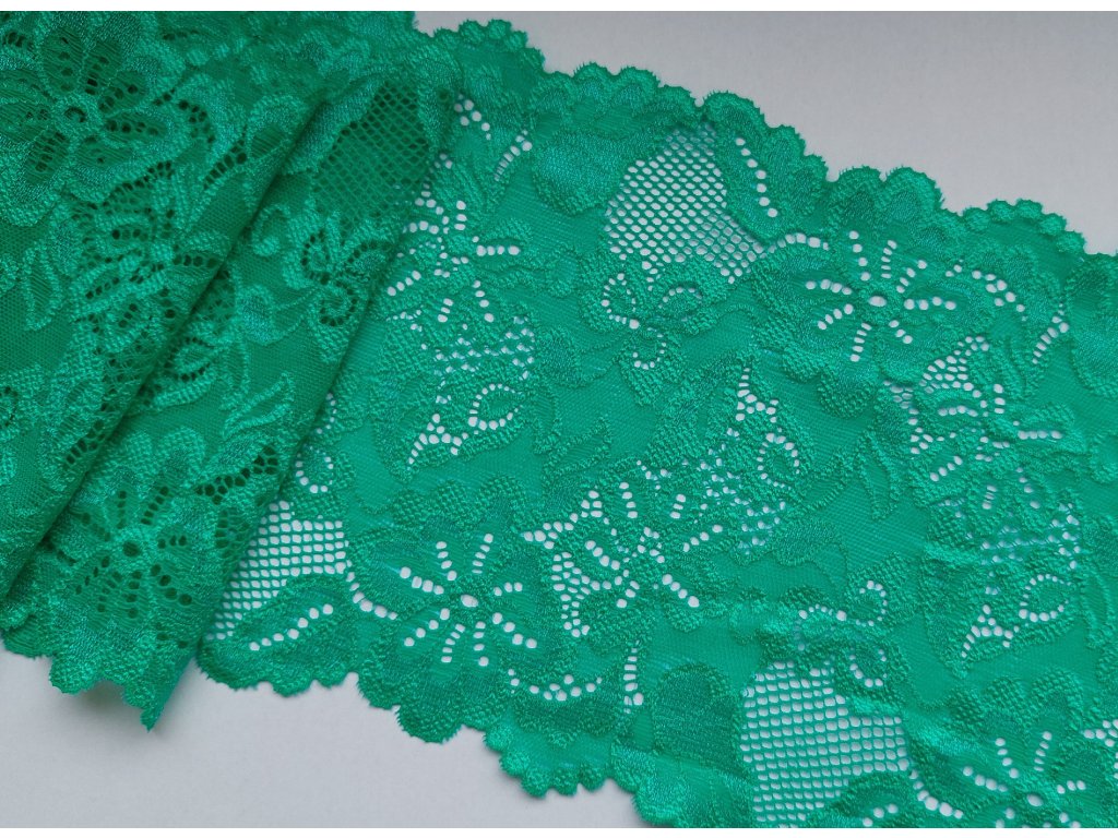Sytě zelená krajka vyšší gramáže s květinovým motivem. Země původu: Čína (TianHai Lace - odkaz na stránky). I když byla krajka vyrobena v Číně, je určena pro přímý kontakt s pokožkou – krajky této firmy mají certifikace typu OEKO-TEX Standard 100 a označení Skin Friendly, což znamená, že neobsahují škodlivé látky.