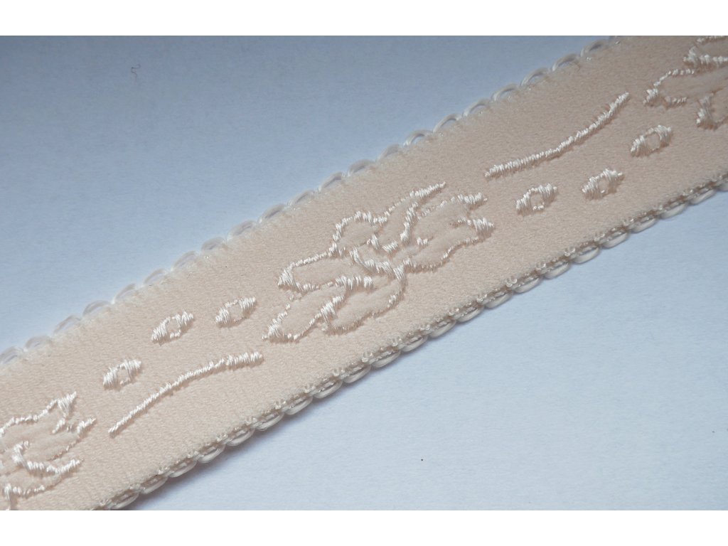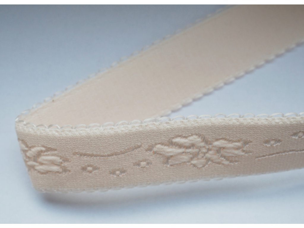 Širší pruženka v pudrovém barevném provedení s jemným květinovým motivem, výrazně pevná v tahu. Země původu: Francie (Cheynet et fils).