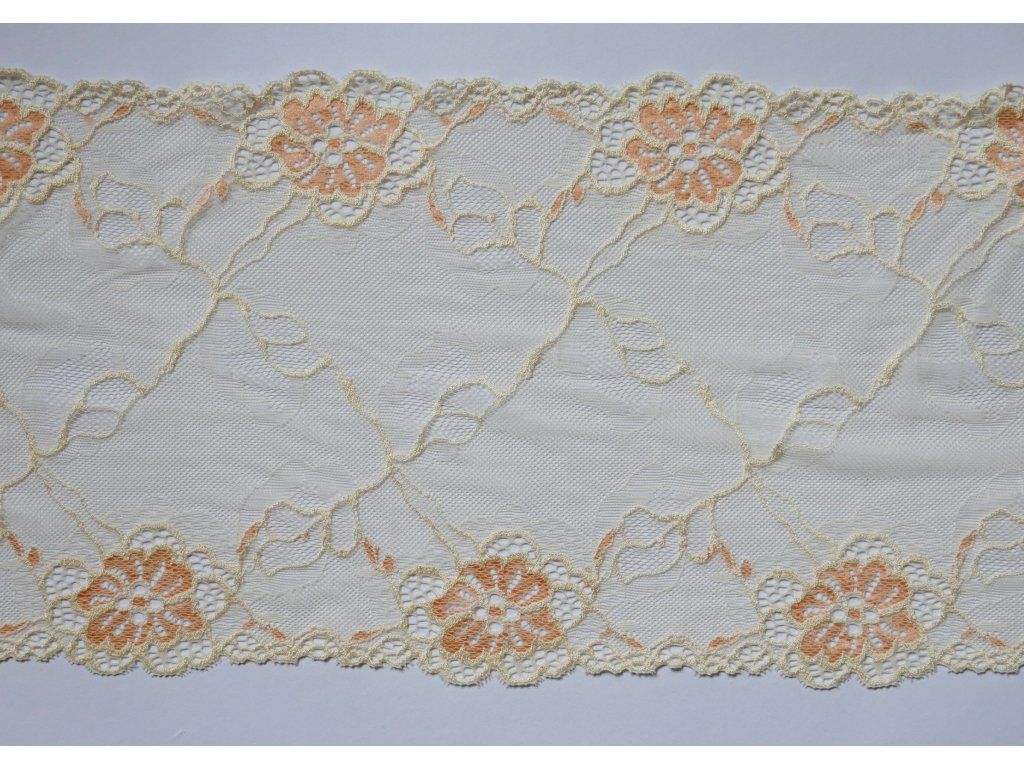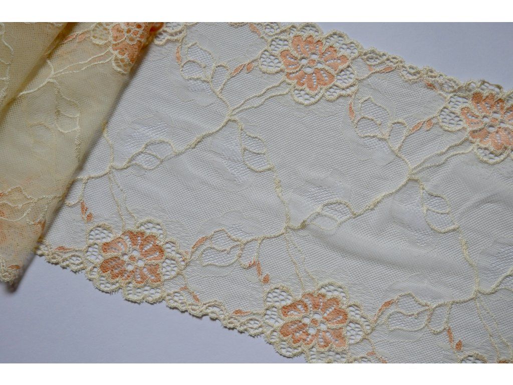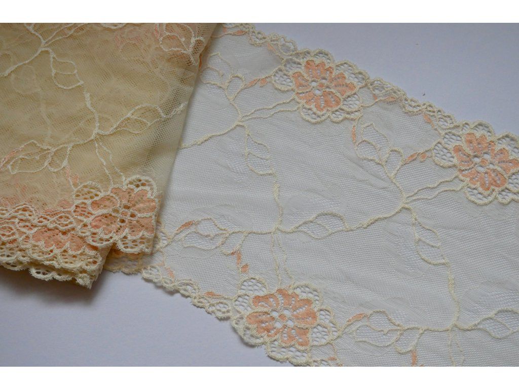 Francouzská krajka ve smetanovém odstínu s motivem květin v jemné korálové barvě po okrajích krajky, původ: Francie/ Calais
