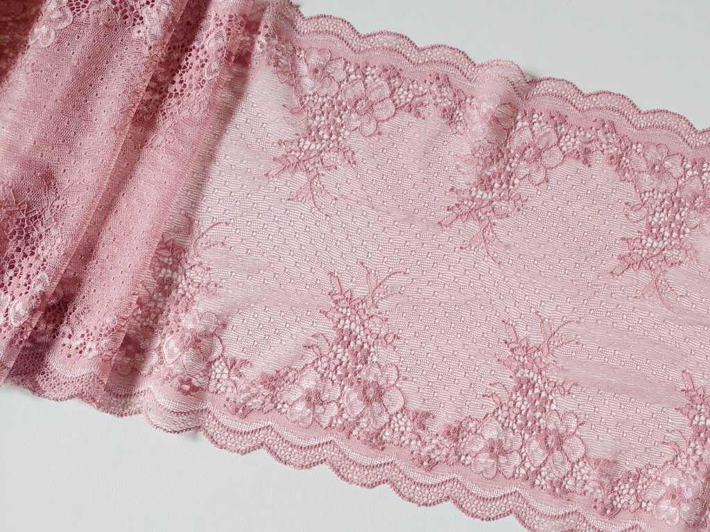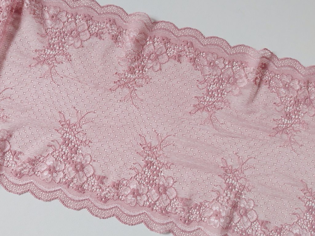 Jemná krajka ve starorůžovém odstínu s květinovým motivem.