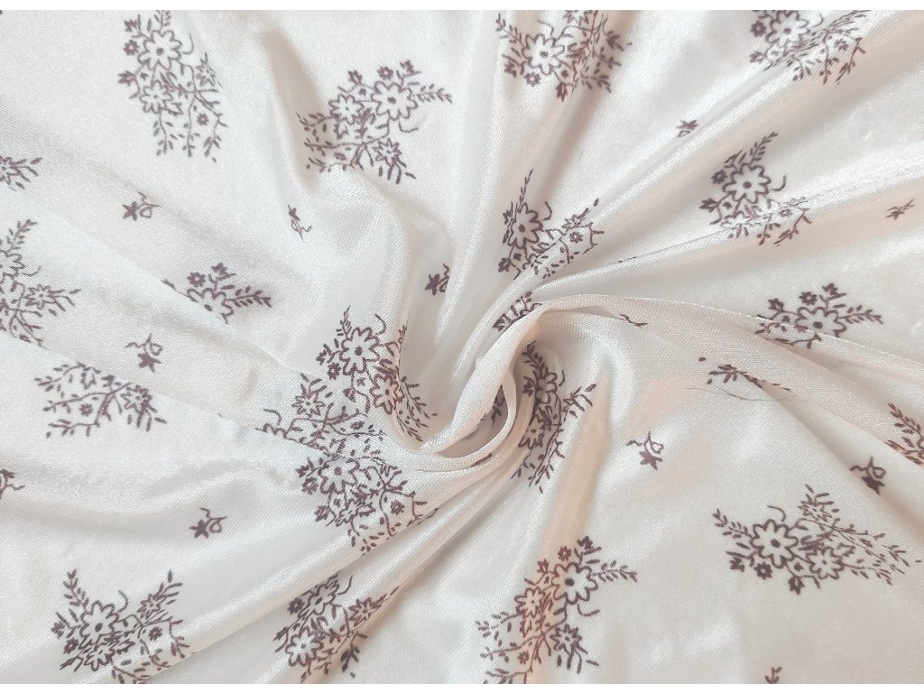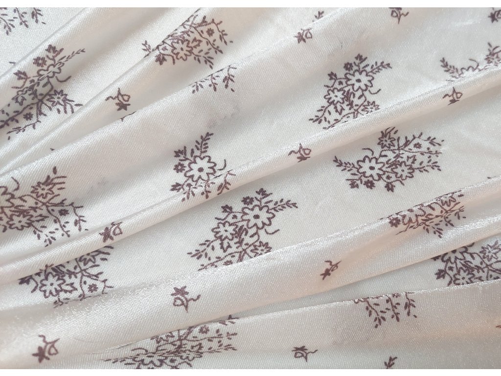 Krásná na dotek hebká látka s motivem hnědých květin s lesklým povrchem. Látka II. jakosti.