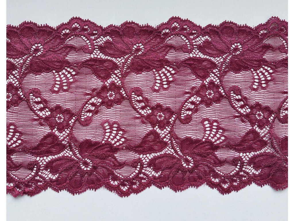 Krásná krajka v tmavě bordó barvě s motivem velkých květů po okrajích krajky.