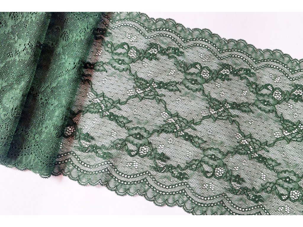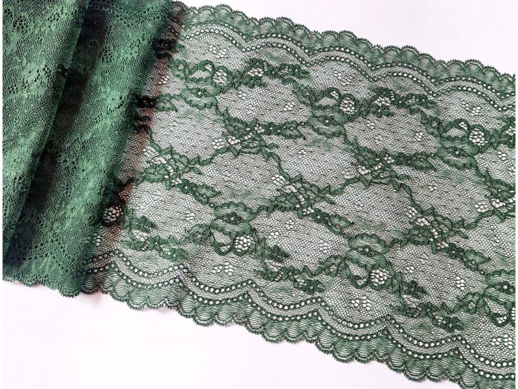 Elegantní pružná krajka v zeleném provedení je ideální volbou pro šití spodního prádla i dekorativních oděvních prvků. Díky své elasticitě se krásně přizpůsobí tělu, zachová si tvar a zajistí komfort při nošení.